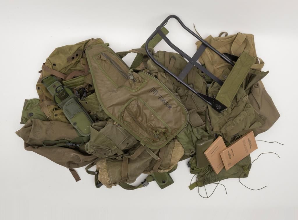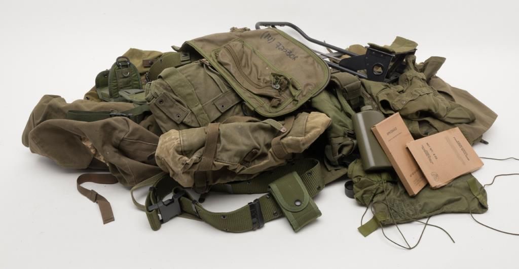 Large lot of various military items and gear; a lifetime collection of soldier (retired) who brought home many items from Korea and Vietnam era and later; many good pieces. Est.: $300-$600.