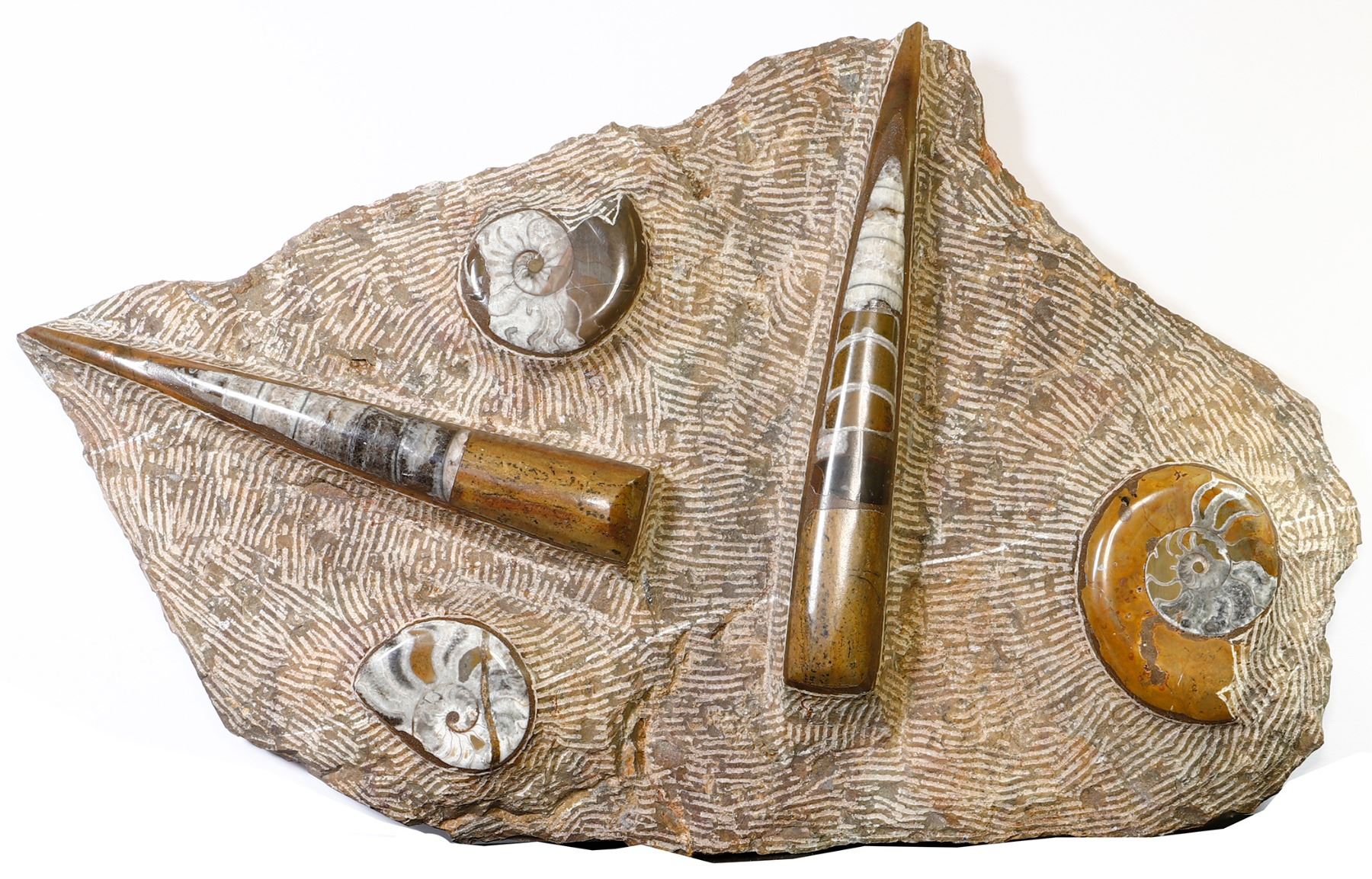 Large matrix of ammonite and orthoceras fossils, Devonian period, approx. 470 to 360 million years old, found in Morocco. roughly 23" x 14" x 3". Stunning display of two large polished orthoceras and three polished ammonites, all fossilized in a striated rock matrix, a substantial piece of ancient natural history. FRAGILE - PICK UP IN PERSON ONLY.