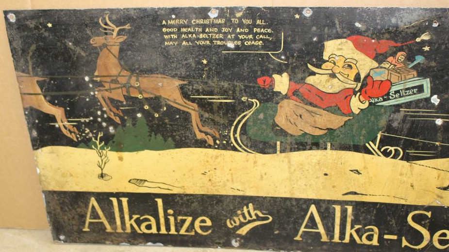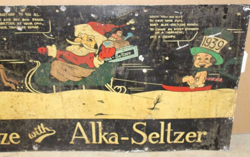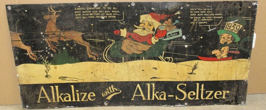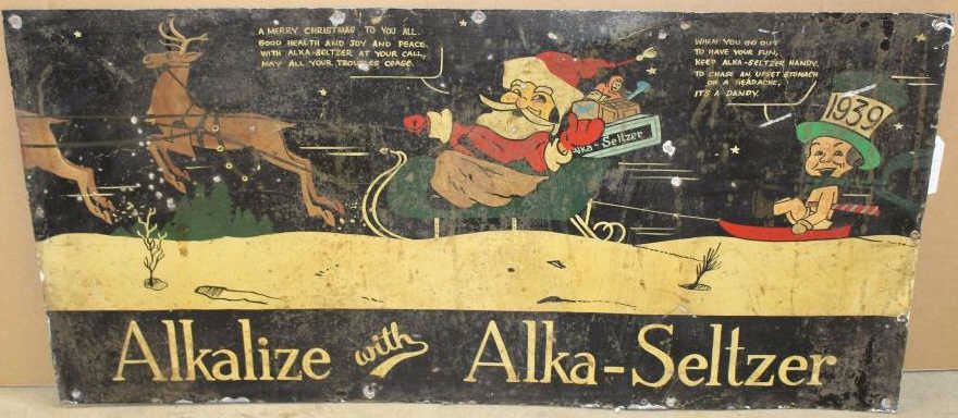 Large metal painted sign advertising “Alkalize with Alka-Seltzer showing Santa Claus and reindeer pulling a newborn on sled with “1939” New Year hat; approximately 18” x 36” showing most of the original paint;some scattered chips to dirty surface that is uncleaned. Great subject matter! Est.: $100-00