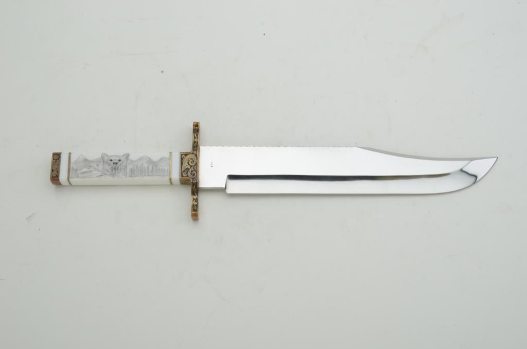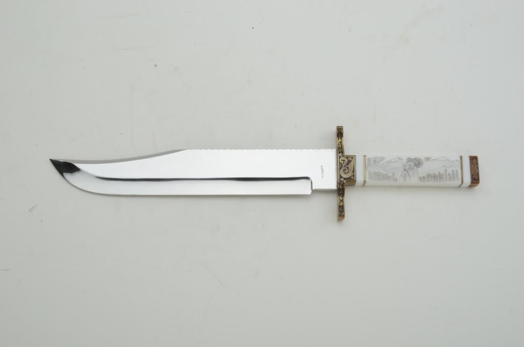 Large modern clip point Bowie knife marked Torbett and #001 with engraved brass cross guard and pommel with etched composite grip, approx. 18” overall with a 12” blade in like new condition; no sheath. Est.: $200-$400.