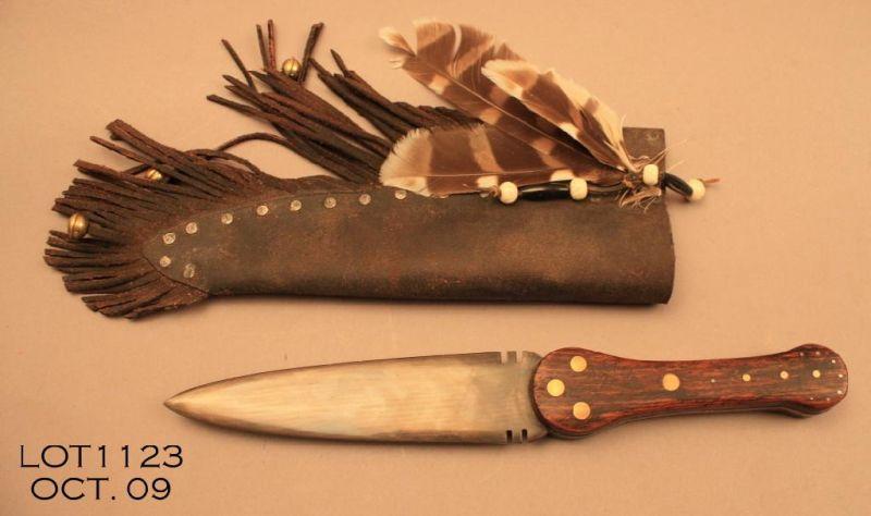 Large modern made Indian dag style knife and leather sheath with feathers, beads and small brass bell ornamentation, approx. 13-1/2” overall with approx. 7” unmarked blade; wood grips are attached with seven brass rivets and the base ofeach grip metal piercing decorations; the sheath is fringed and iron riveted. A nice looking display piece. Est.: $100-$200.