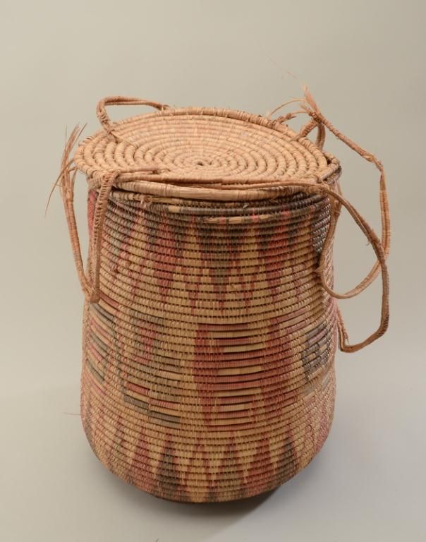 Large multi-colored woven reed basket approx.  20” in height and approx. 15” diameter with  woven matching lid and carry straps showing  damage to straps and separation at bottom;  appears repairable.  Est.:  $100-$200.