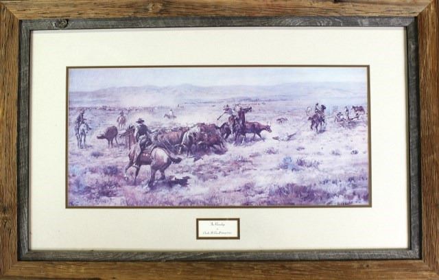 lithograph by C.M Russell, framed 28" X 44". Donated item.