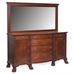 Large oak sideboard, high quality piece with four curved drawers flanked by half drawers and cabinets with original brass hardware, finely carved organic details resting on deeply carved claw feet, large beveled mirrored back, original finish, 79”w x 25”d x 80”h, very good condition