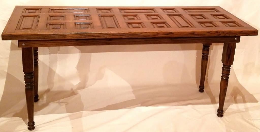 Large oak table made from recycled antique panels from an early Chicago mansion torn down in the 1950's, nicely constructed, skirted on new turned oak legs, full glass protected top, 31" X 79". Commissioned for a Rapic City law office. NO SHIPPING AVAI from an early Chicago mansion torn down in the 1950's, nicely constructed, skirted on new turned oak legs, full glass protected top, 31" X 79". Commissioned for a Rapic City law office. NO SHIPPING AVAILABLE ON THIS ITEM