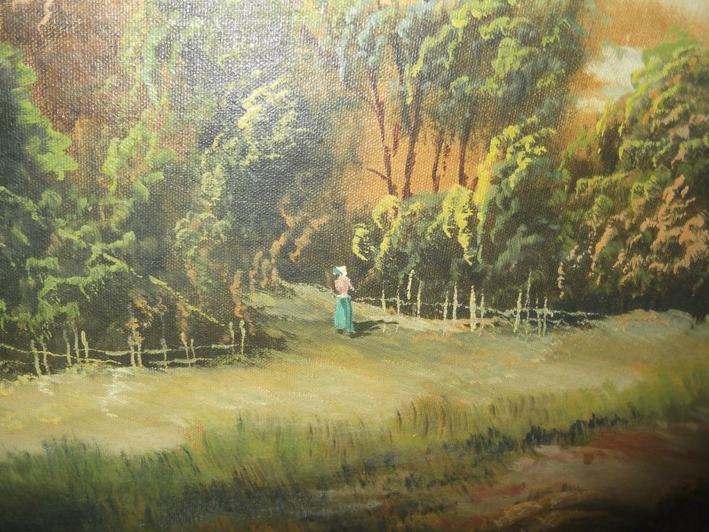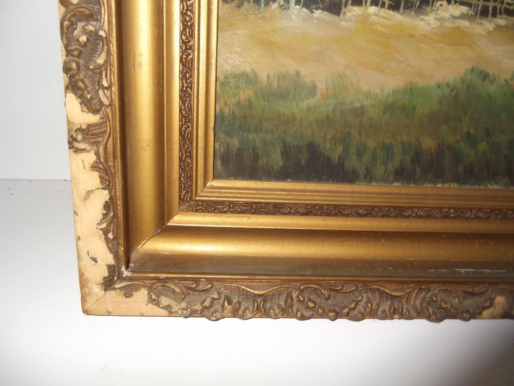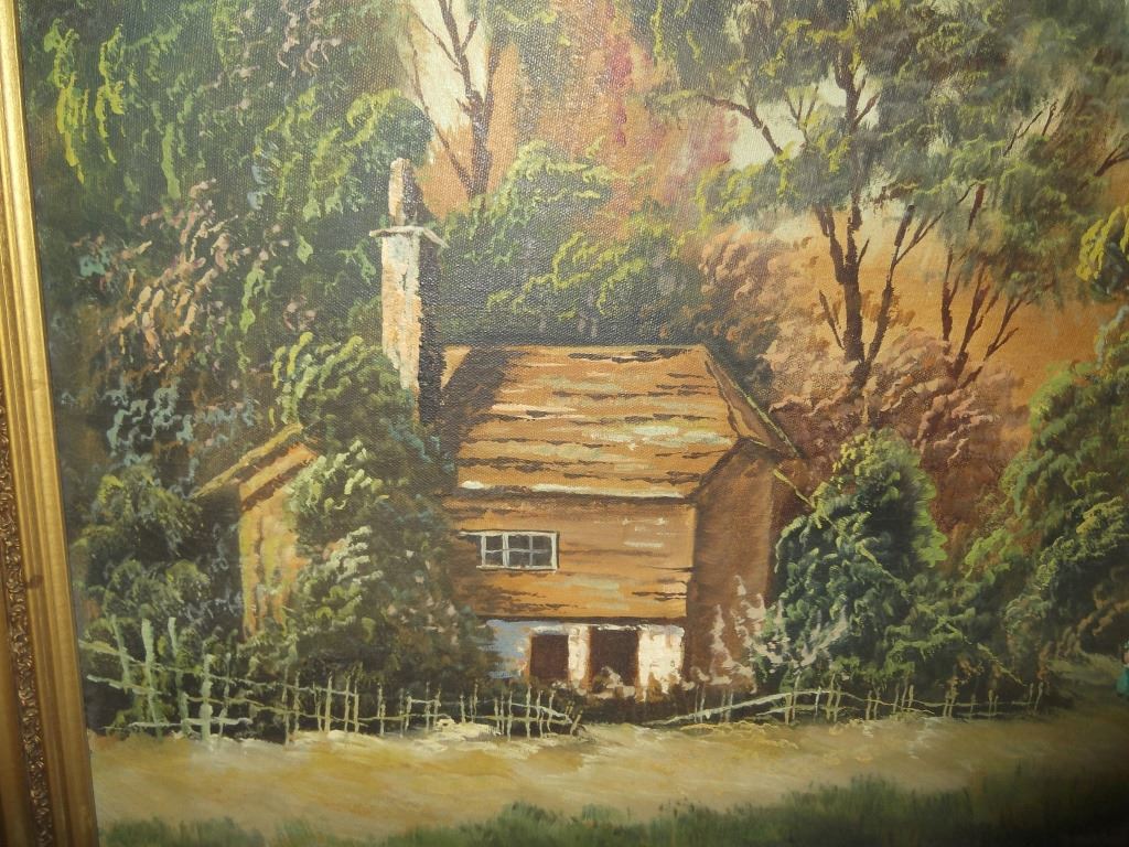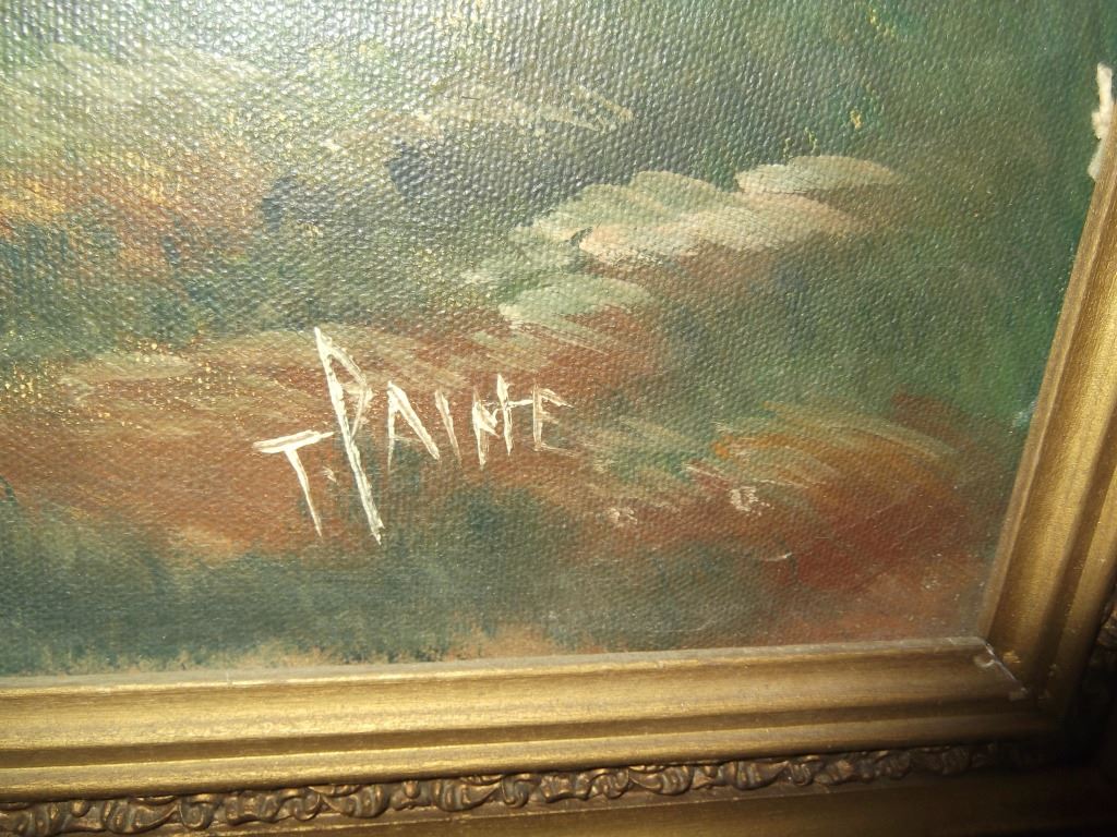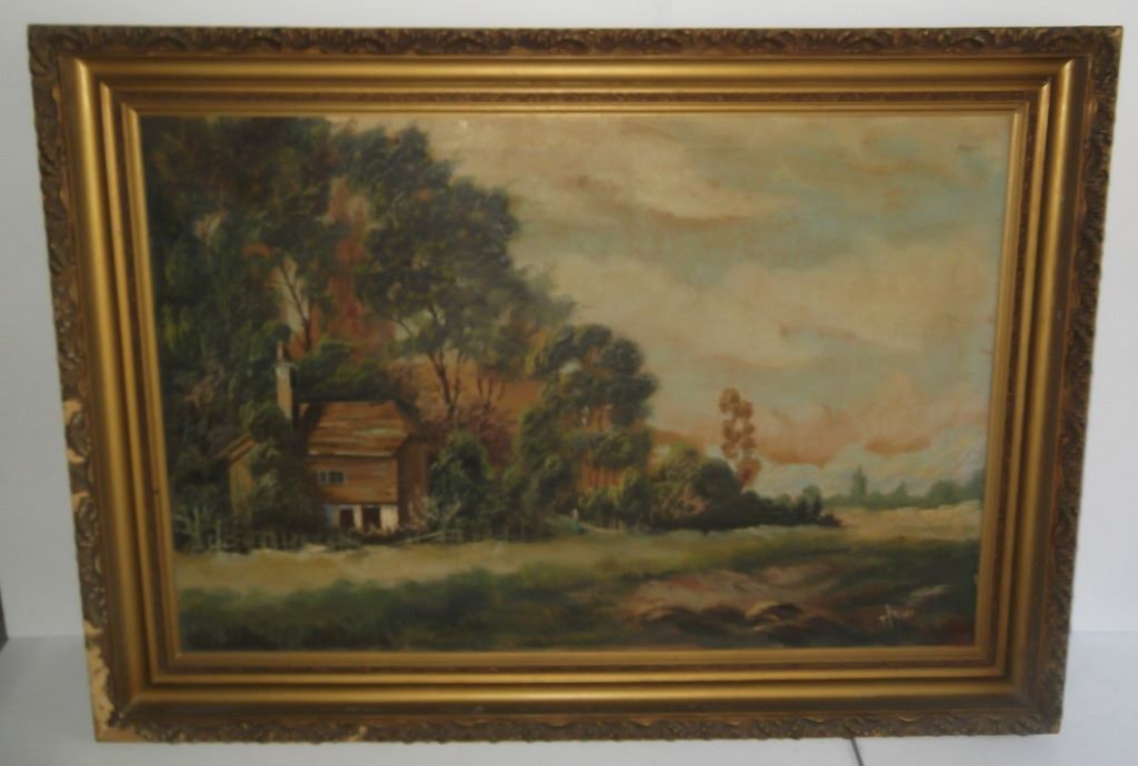 Large oil on canvas house landscape scene, signed T. Paine. Frame lacking pieces. 42 1/2 inches x 30 inches.