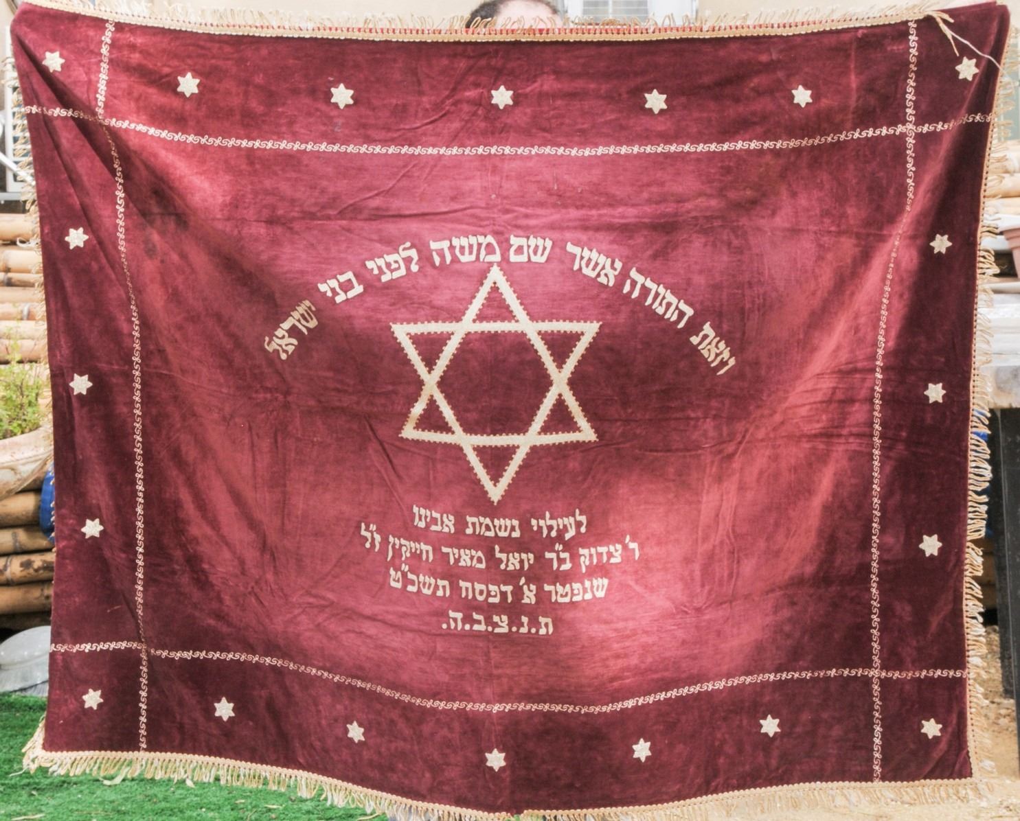 Large old Torah ark curtain for the stage, with embroidery and Hebrew inscription describing the donation of the item by the children for the ascendence of their father's soul, very good condition, dimensions: 156x126 cm.