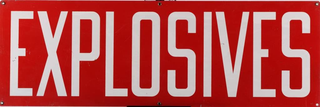 Large old enameled metal sign “EXPLOSIVES”, approximately 10” x 30” in overall very good to fine condition. Est.: $100-$175.