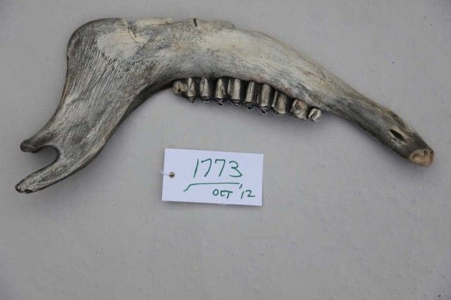 Large old jawbone with carving of an Indian face, approx. 15” overall with a row of large teeth still in place; consignor states this piece was purchased in the 1980s in Colorado and was described at that time as aceremonial buffalo jaw made during the later part of the 1800s and was wrapped in newspaper dated in the mid-1930s when purchased. Est.: $100-$200.