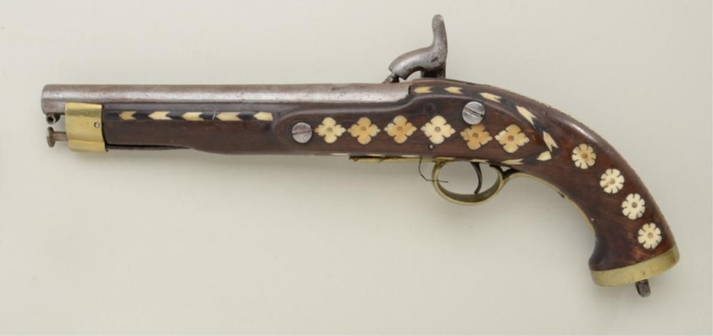 Large older mid-eastern style single shot percussion pistol with standing lion mark on the lockplate and “C 3” marking, .60 cal., 9” round barrel, bone inlaid stock with brass mounts, iron ramrod and iron lanyard ring.This gun is in overall good condition with a light grey patina on metal surfaces, good action, dark bore, overall good wood stock with some scattered edge wear and loss and extensive bone inlays and decorative arrowline work design. Est.: $300-$600.