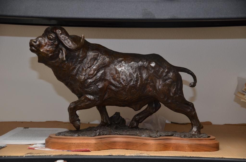 Large original bronze casting of Cape Buffalo signed C. Bunn and numbered 1/10 mounted on wood base approximately 17”x 27” in width. From the estate of Robert E. Petersen who preferred the number 1 in bronzes whenavailable. Est.: $3,000-$6,000.