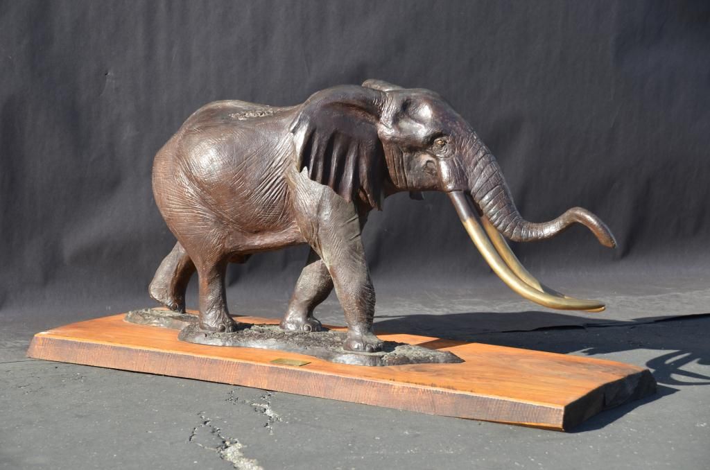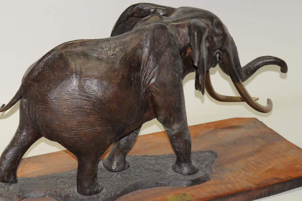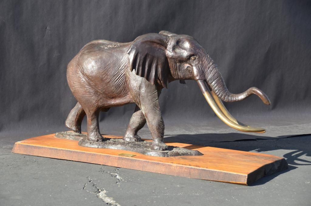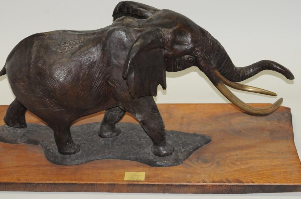 Large original bronze of bull elephant signed T.O."Terry" Matthews, approx. 37” in height by 40” across base in length and approx. 100 pounds or more in weight. The condition is fine to excellent. From the estate of RobertPetersen. The bronze is numbered but not clearly; possibly #1. Est.: $2,500-$5,000.