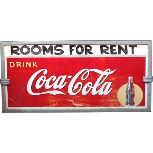 Large outdoor Coca-Cola Tin Sign "Rooms for Rent" has the Trade Mark in the Tail Has a wooden frame 36 x 72 "