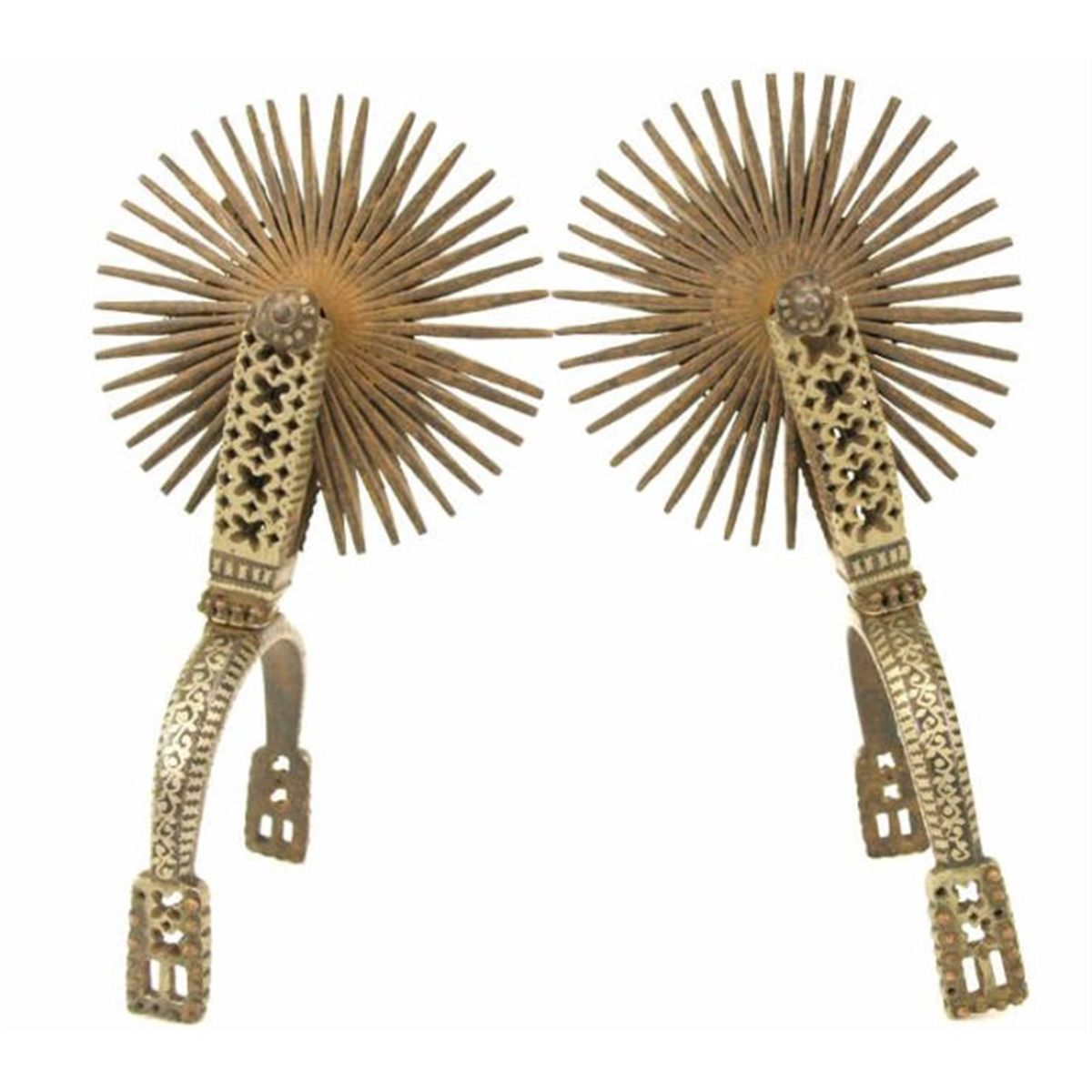 Large pair 19th C. Gaucho spurs with 5" rowels beautiful silver inlay, show good old original condition.