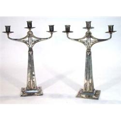Large pair of Art Nouveau successionist style silver plated three branch candelabra with square b…