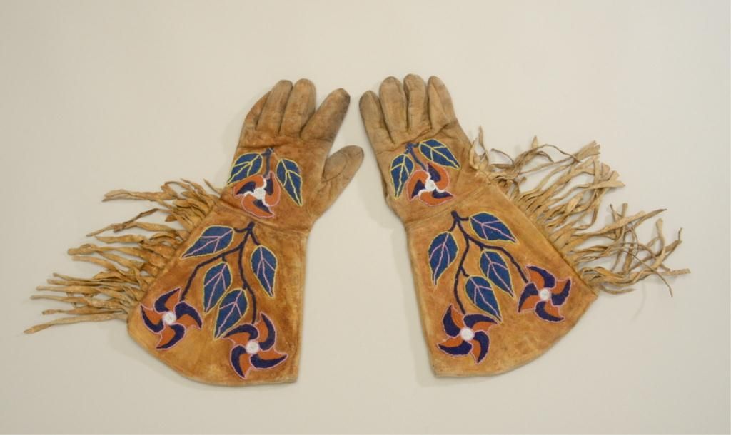 Large pair of beaded and fringed gauntlets in overall good condition with trade cloth interior lining. Est.: $150-$300.