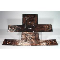 Large pair of hammered copper Arts and Crafts door plates, embossed with stylised leaves, 60cm high