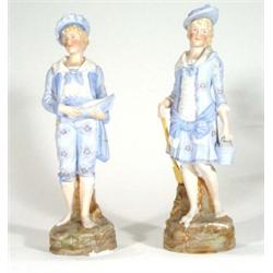 Large pair of hand painted bisque figures , a young girl and boy, the boy clutching a boat, the girl a bucket, 38cm high