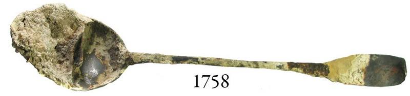 Large pewter spoon. 354 grams, 16" long. Effectively a big ladle with long, thin handle terminating in a flattish end, the bowl typically oval-shaped, 100% intact but thickly encrusted with white coral and spots of pink and some rust, some areas of clean pewter peeking through. Recovered from: 1733 Fleet, Florida Keys