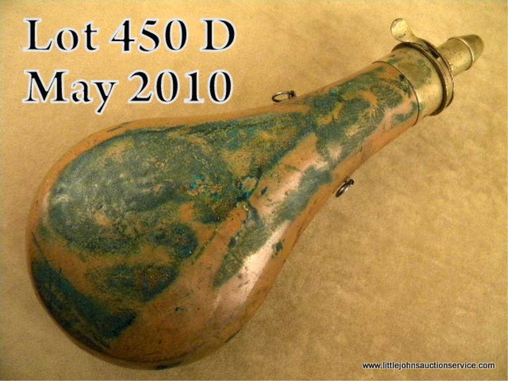 Large plain brass shotgun flask by Batty dated 1847, approx. 9-1/2” x 4” in overall untouched good condition with old initials “A.J.H.” inscribed on one side of the flask and scattered areas of verdigris on the body of the flask thatcan be removed by a careful cleaning. Est.: $30-$60.