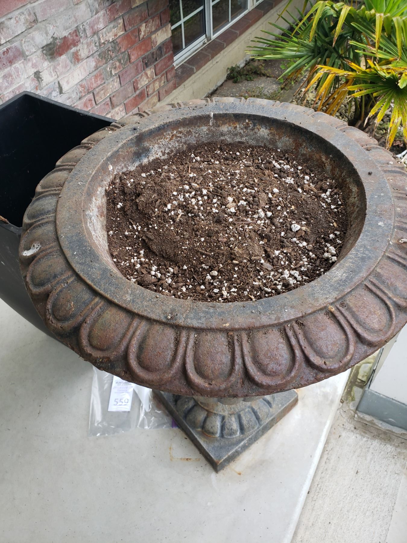Large cast iron 20x20x24 planter and plastic container. Very heavy. Bring appropriate help to move to category A between 11am and 12pm.