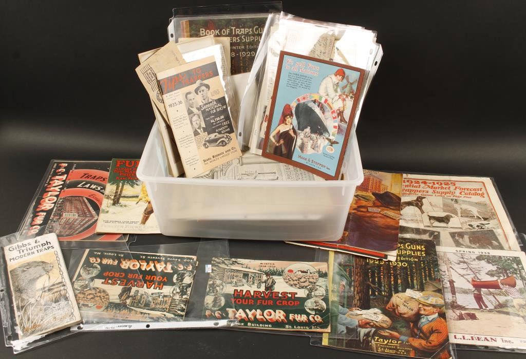 Large plastic case of various booklets and advertisers for fur trapping, the fur trade and some gun literature including some ca 1940 Gun Report Monograms. Great reference material. Est.: $150-$300.