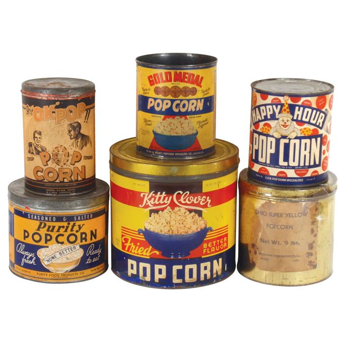 Large popcorn cans (6), Kitty Clover, Ohio Super Yellos (torn label), It's "OK" Pop, Gold Medal (no lid), Purity & Happy Hour (full) all w/paper labels & VG cond, 7-9.75"H.