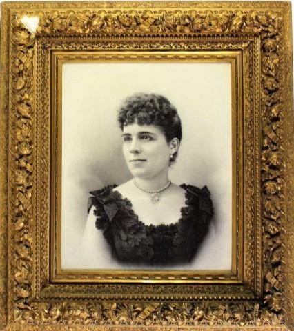 Large portrait of early Deadwoodelite Victoria Ann Wilson form the historic Victorian House of Roses. Home was built in Deadwood in 1870-1880's by attorney James Wilson for his bride Victoria Ann. Upon arriving in the Deadwood camp she was quotedas saying "thank god for the roses" which grew on the hill next to the home. The 27 room mansion was decorated in rose pattern wall paper and filled with the finest furnishings and decor, featured a largeballroom and outdoor rose gardens. The portrait was purchased by consignor many years ago at the home contents onsite auction. Portrait mounted in its original spectacular gesso frame, high relief roseborder around perimeter, fine condition with exception of loss at upper corner of frame, 3 7.25 X 43". Est. 1250-2500