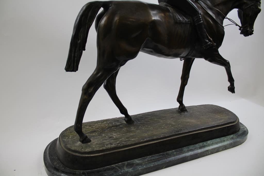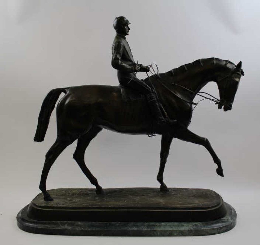 a jockey riding a race horse, approximately 28” in height and 30” in length overall; beautiful patina to bronze and finely accomplished. Est.: $600-$1,200.