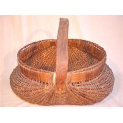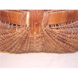 Large primitive woven buttocks basket. Measures 17" tall & 22" wide. Basket is in average condition with some breaks visible.