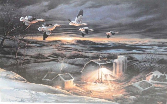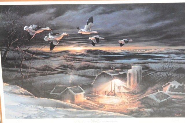 Large professionally framed and matted hand signed limited edition (965/1500) color print by noted wildlife artist Terry Redlin entitled “Night Light” with Certificate of Authenticity, approx. 30” x 39” overall andin excellent condition; also marked South Dakota Ducks Unlimited 1985 Sponsor Artist of the Year Painting. Est.: $100-$300.