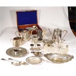 Large quantity of silver plated items including three piece teaset, cruets, part canteen of cutlery, dishes etc