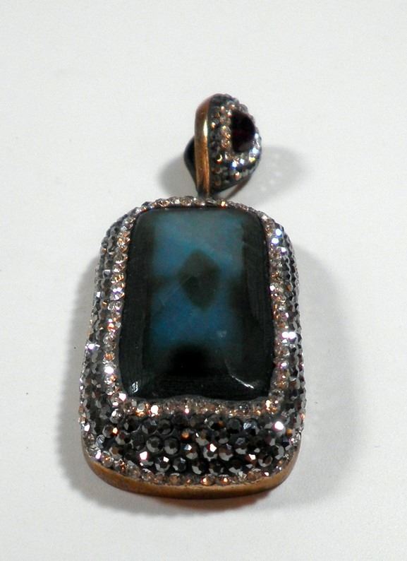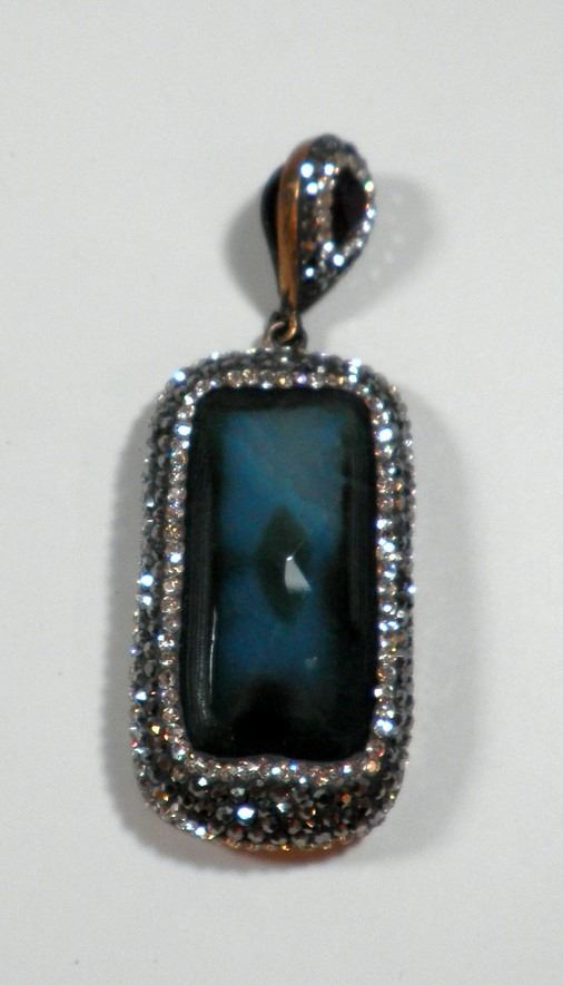 Large rectangular silver and brass set with central blue gemstone surrounded by transparent stone settings, weight: 41.5 gm, dimensions: 3x8 cm.