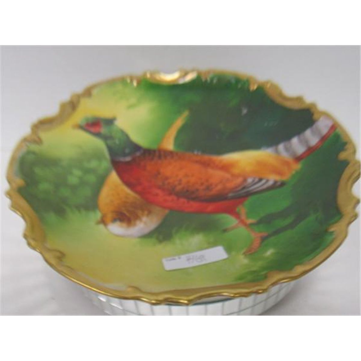 Large round pheasant dish gold trim -Coronet France-11 1/4 across-few worn spots in the paint