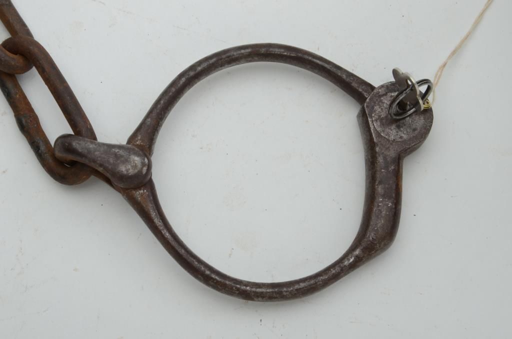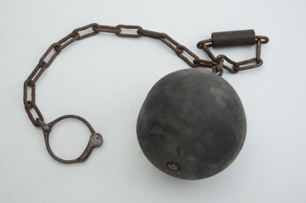 Large rubber coated iron ball and chain with half a Bean leg iron for the shackle portion with key; ball is approx. 8” in diameter. From an old collection. Est.: $150-$250.