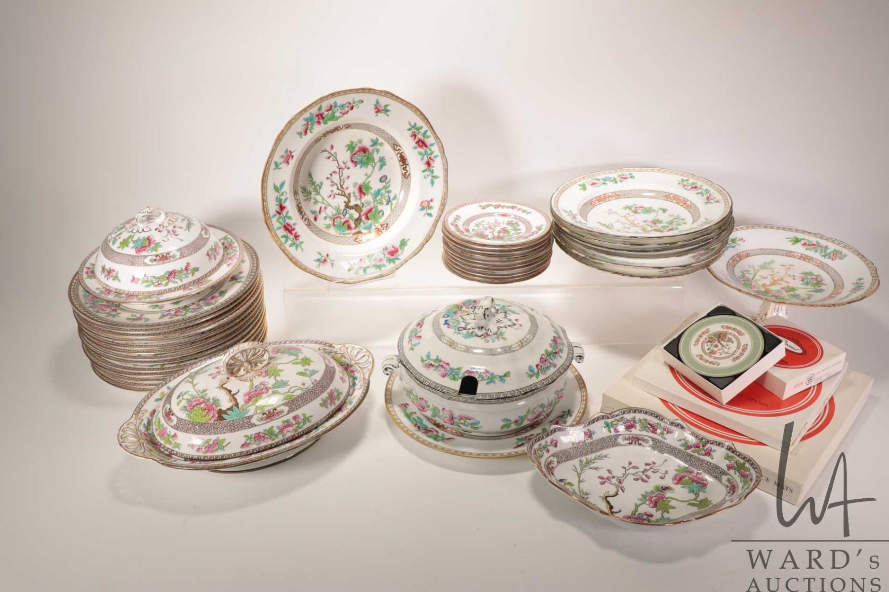 Large selection of Copeland Spode plus unmarked Indian Tree tableware including lidden muffineer, 13 10 1/2" plates, 10 6" plates, 7 10" bowls, comport and soup tureen. Plus boxed Pimpernel place mats, casserole stand and coasters. Note: Not available for shipping. Local pickup only
