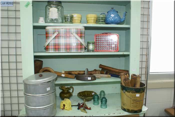 Large selection of collectible and primitives including sadirons, stacking canisters, tins, McCoy pots, treenware, insulators etc.