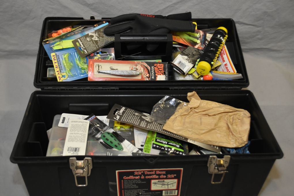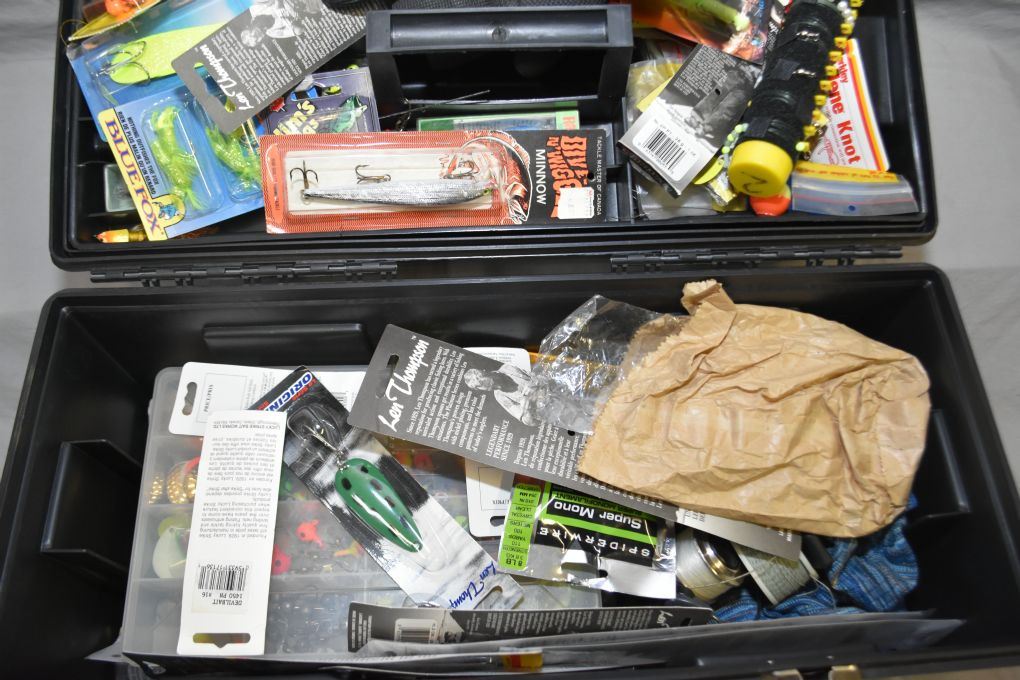 Large selection of new fishing tackle and reels w/ almost new black tool box