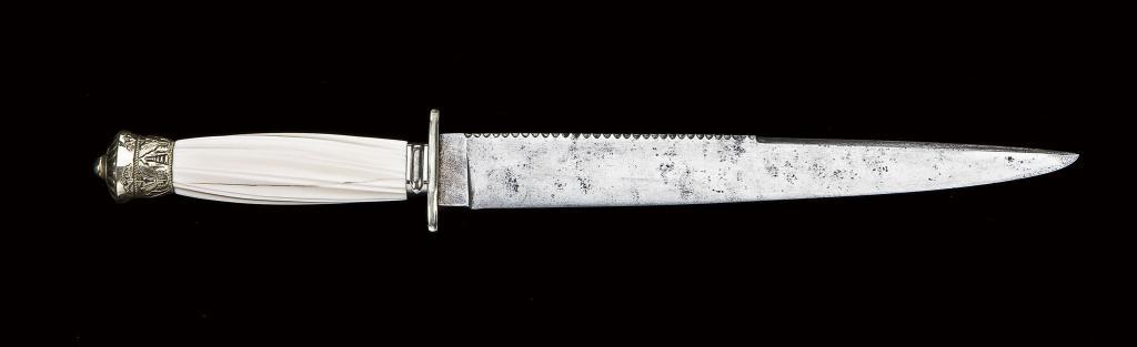 Large semi-clip point Bowie knife by Marches and Shepherd Pond Works, Sheffield with “W” and Crown “R” markings. Circa approx. 1830-1837. Approx 17-1/4” overall with 11-1/4” blade of heavy stock (5/32”). Blade has a pronounced false edge (sharpened) with file work blade back. The blade is in good condition and show some cleaning, minor pitting, and sharpening. The hilt has been professionally restored and fluted ivory grip replated. A handsome knife with legitimate restorations. Hugh Hayes Collection. Est: $3,000 - $6,000