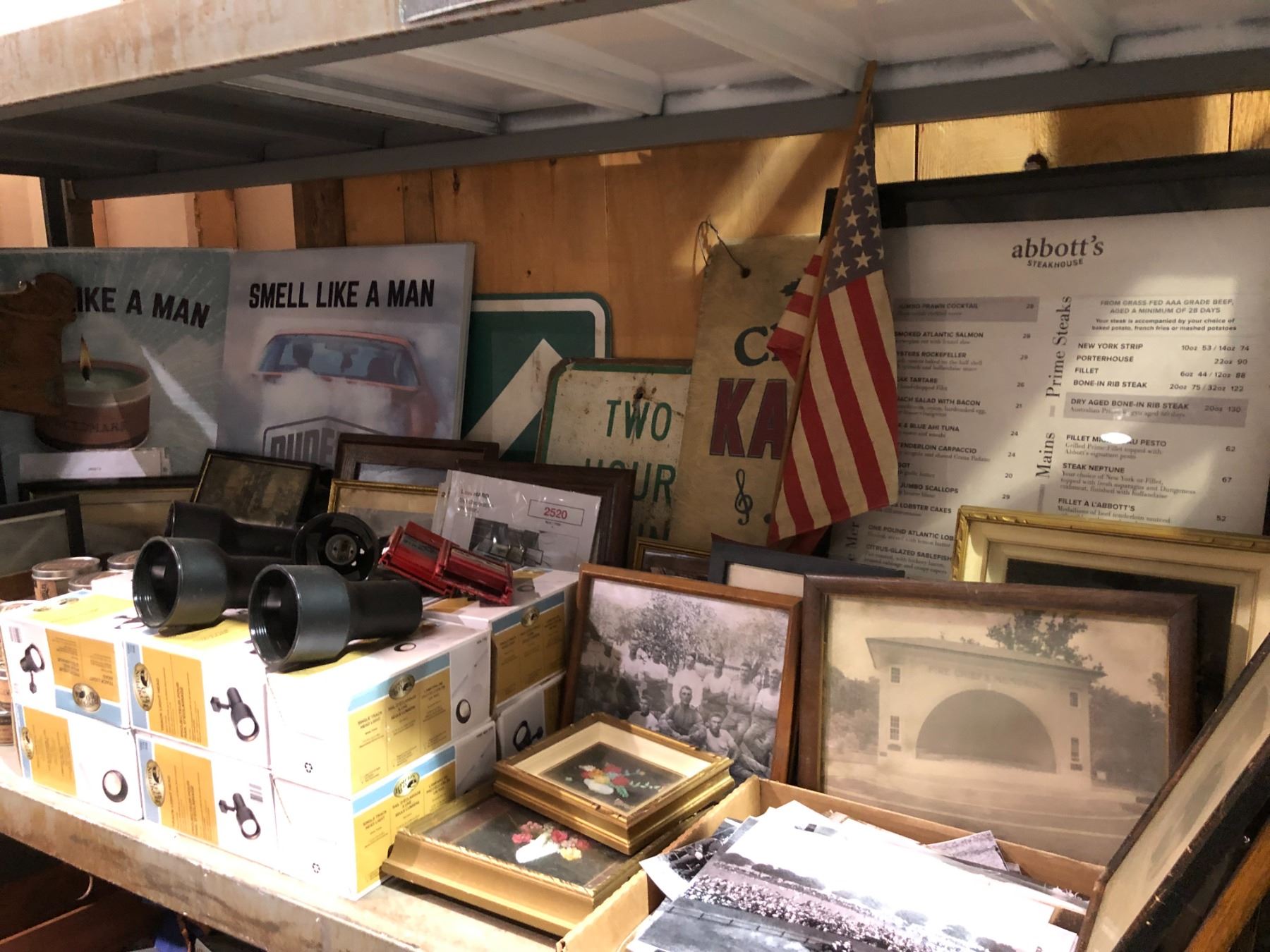 Large shelf lot of assorted film production background props & misc. love show