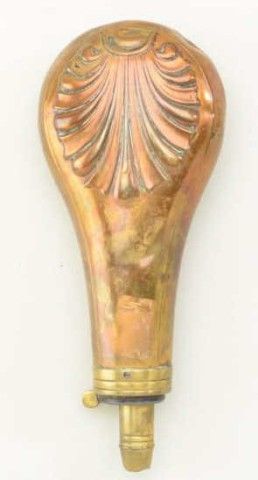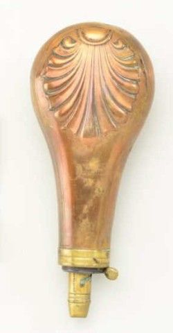 Large shotgun flask mid 19tht century, embossed shell design, 3 stage charger marked Dixon & Sons. Good condition, spring intact, measures 8" from tip to end. Est.; $75.-$150.