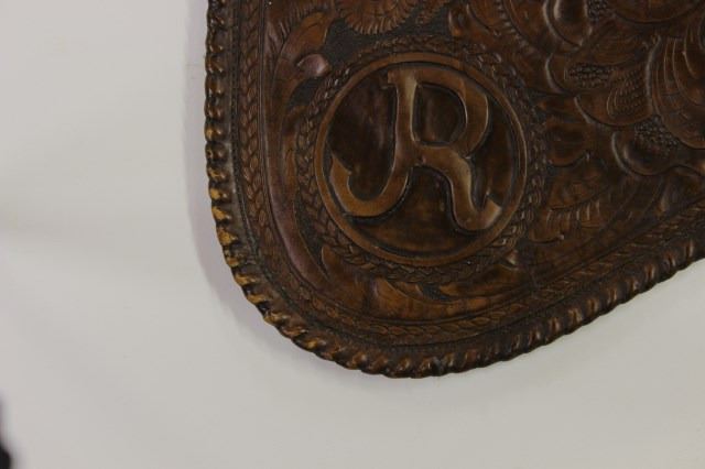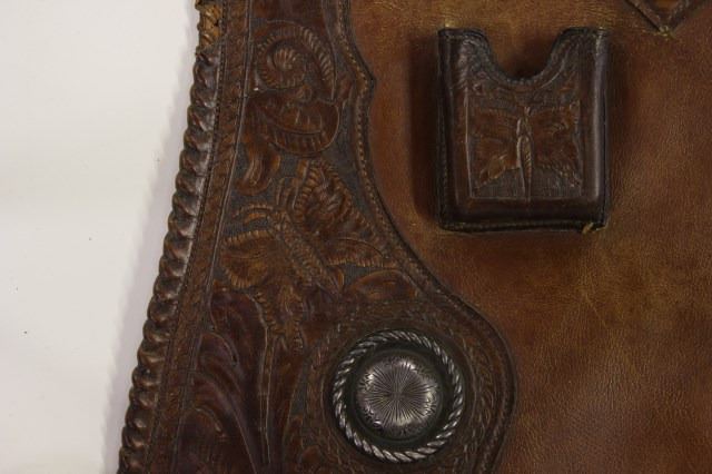 C. 1940's attributed to California maker Bob Brown (19010-2005) with McCabe sterling conchos monogrammed R or JF on lower corners. Through his Range Busters Corral shop in Hollywood Bob did work for many of the Hollywood cowboys including William S Hart, John Wayne, Roy Rogers, Rex Allen and others, using a screwdriver for all his leather carvings. Chaps are somewhat dry in need of leather conditioning. Chaps display very nicely measuring 43" long.