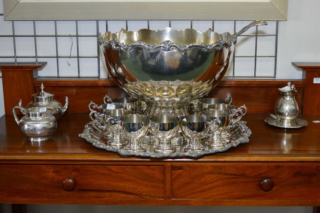 Large silver-plate punch bowl set with bowl, twelve punch cups, drip tray and punch ladle plus a silver-plate cream and sugar, and lidded pot with drip tray