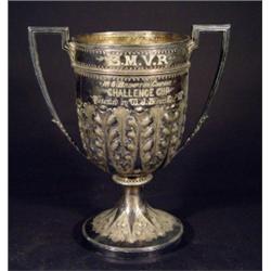 Large silver plated twin handled trophy embossed with acanthus leaves, engraved 'S.M.V.R., No. 6 Brompton Company Challenge Cup Won By Col. Segt. C.W. Borette', 31cm high