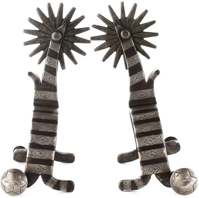 showing fine original condition, classic split heel band, 6 point star engraved buttons, 1" heel bands, 3" chap guard shanks and 2 1/2" punch dot rowels. Steel surfaces show natural silver gray drifting to blue plum patina. Est. 3500-4500