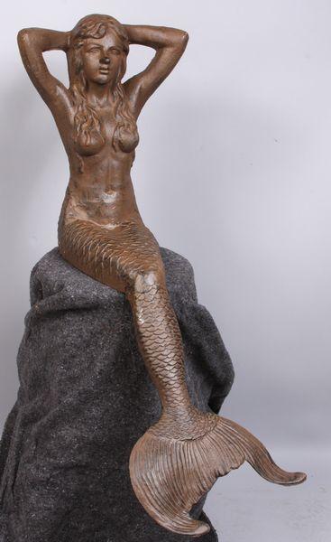 Large sitting mermaid made of iron, having very detailed features including fins, scales, hair and facial features.