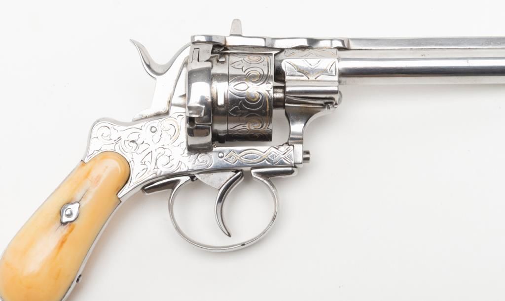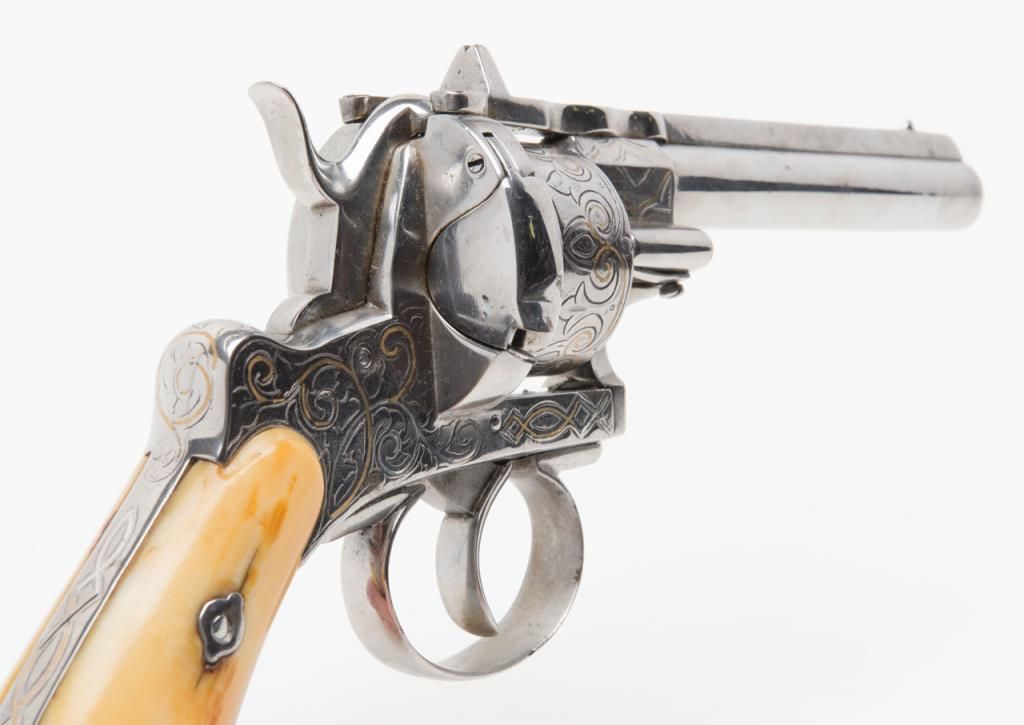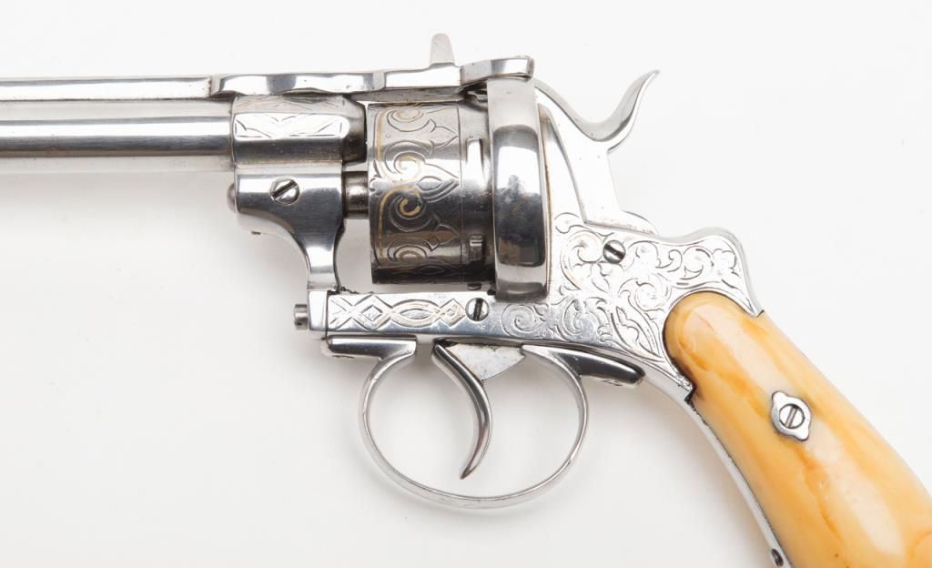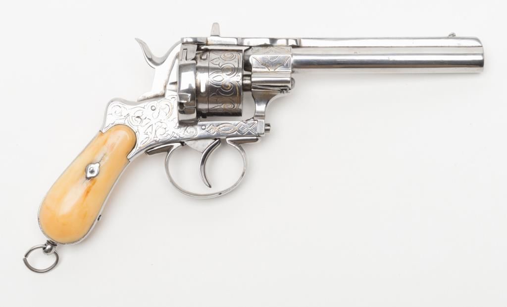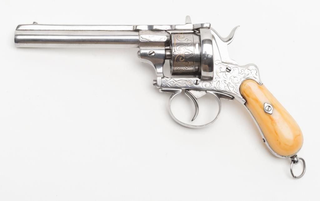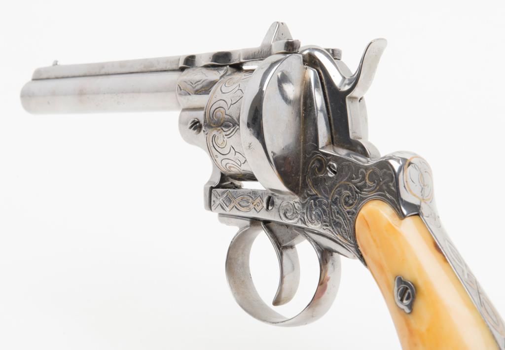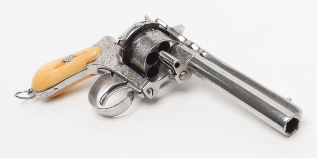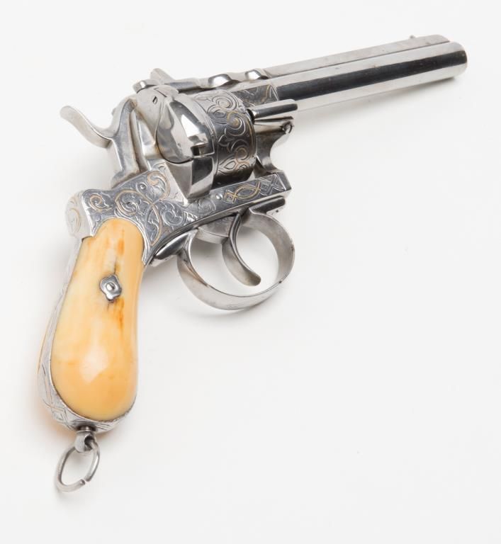 Large size pinfire pistol with engraved and inlaid scrolls, bone grips, circa 1850’s-60’s; polished to bright with good action and good overall; Central European. Est.: $350-$700.
