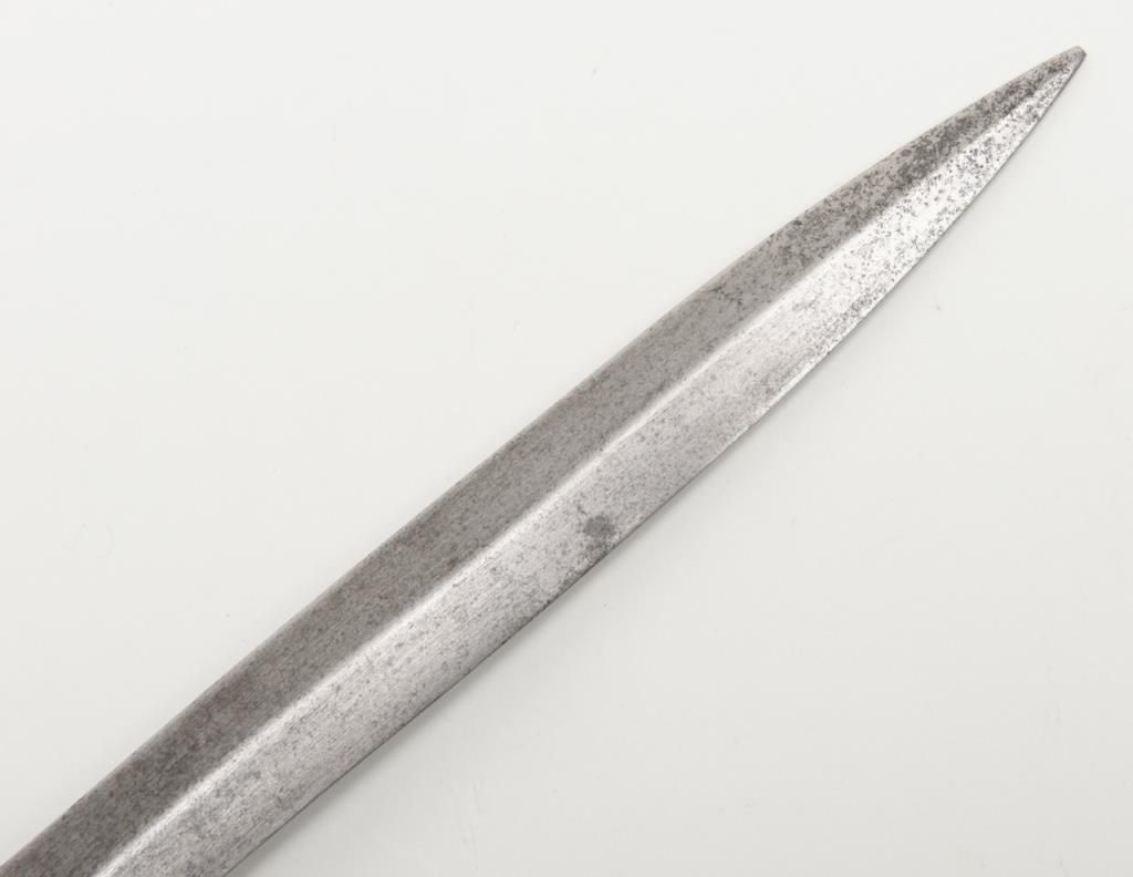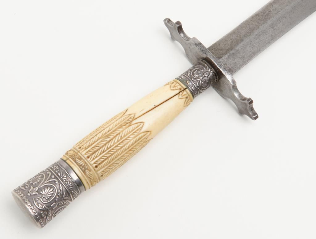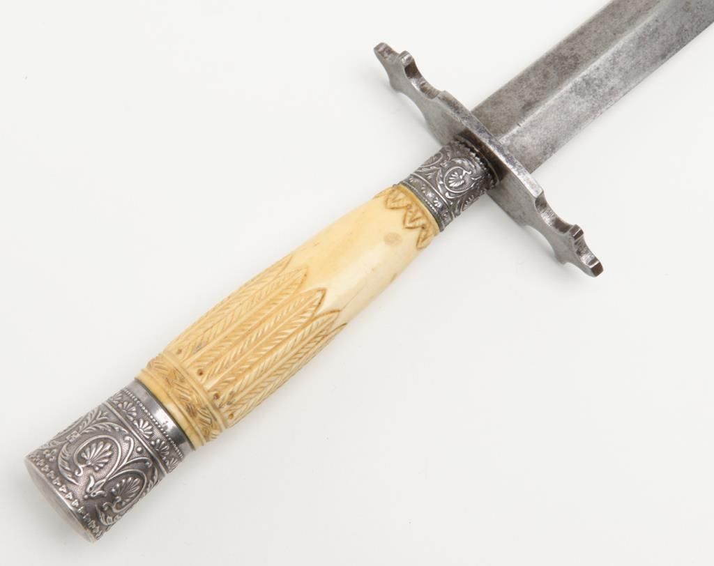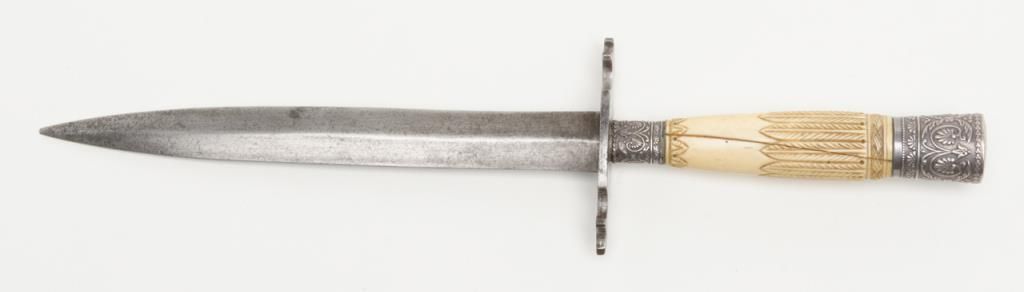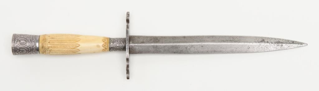 Large spear point dagger or dirk with 7-3/4" blade, 12-7/8" overall, iron guard, carved bone grip, silver mounts. The blade and guard show some light pitting, but otherwise good condition; the grip is nicely carved and shows a split. The ferrell and cap show fancy designs. A very attractive 19th century dirk that is most likely English; our consigner notes states: "S. Osborn Sheffield best refined cast steel" is marked under the handle but we did not want to remove the grip. Est.: $500-$1,000