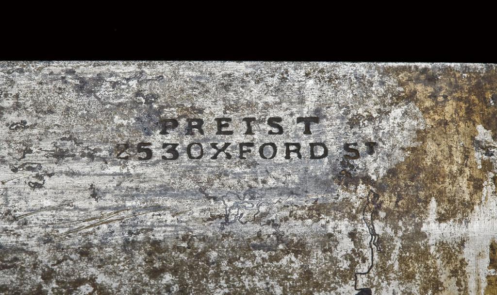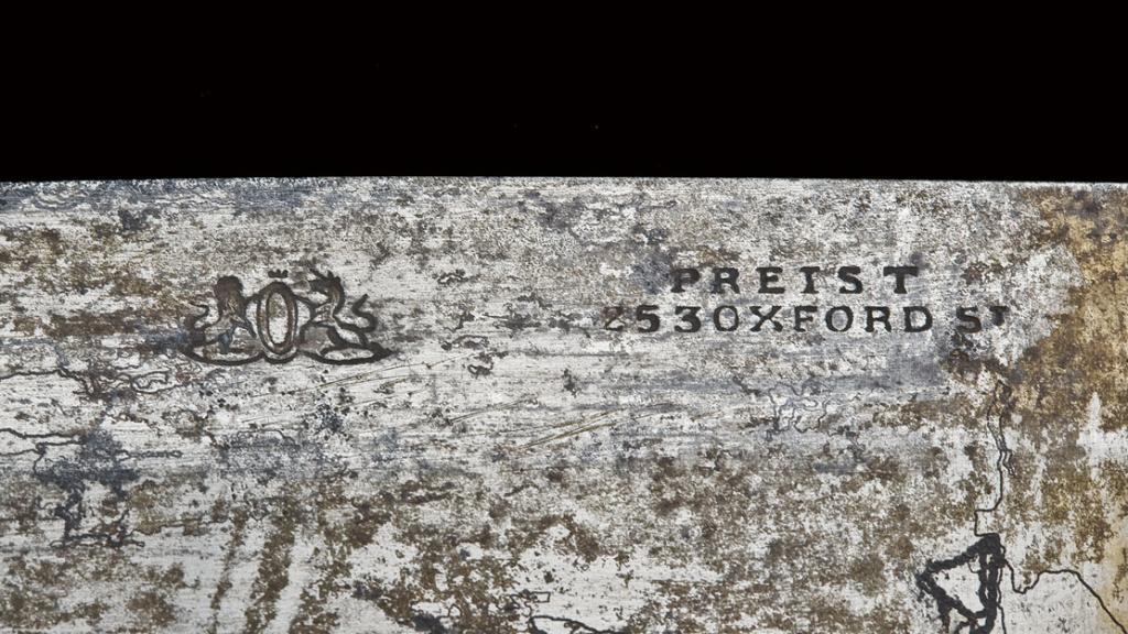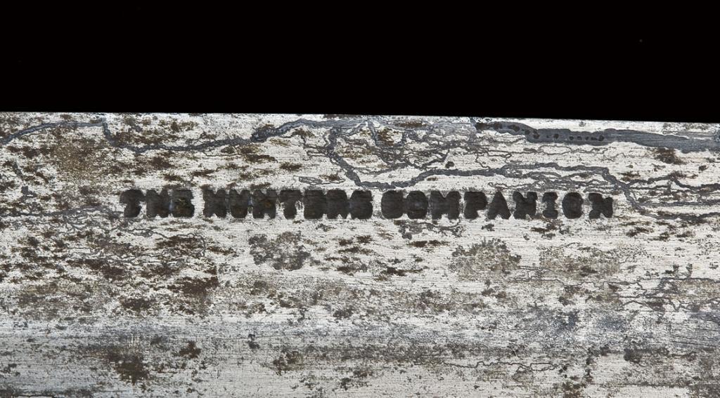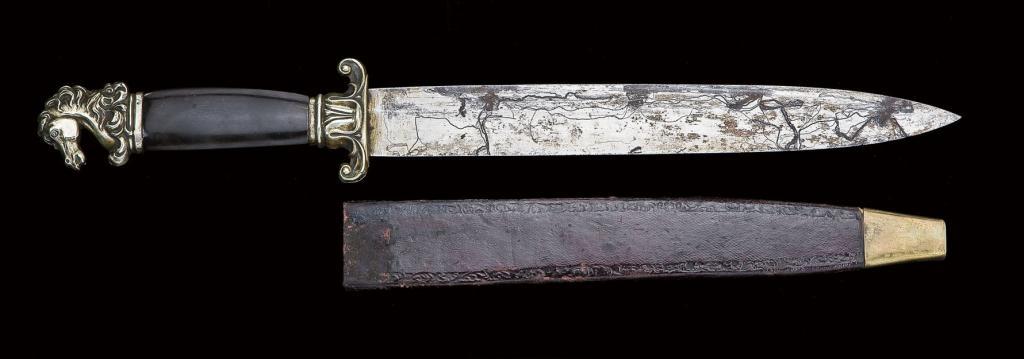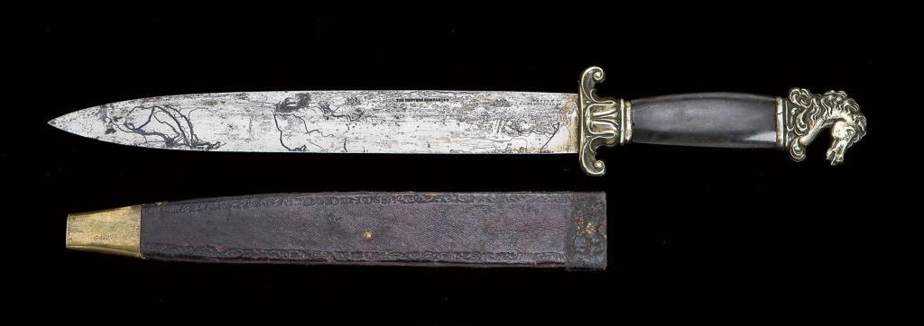 Large spearpoint bowie knife by Preist of London with horsehead pommel and fancy crossguard. Dark buffalo horn grip with period replacement scabbard, missing the throat. Marked “Hunter’s Companion” with logos. Approx 19” overall with 12-1/4” blade. In good to very good condition with natural patina, some pitting and staining. Good edges with full tip and untouched condition. Circa late 19th to early 20th century. Hugh Hayes Collection. Est: $2,500 - $5,000