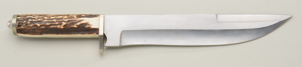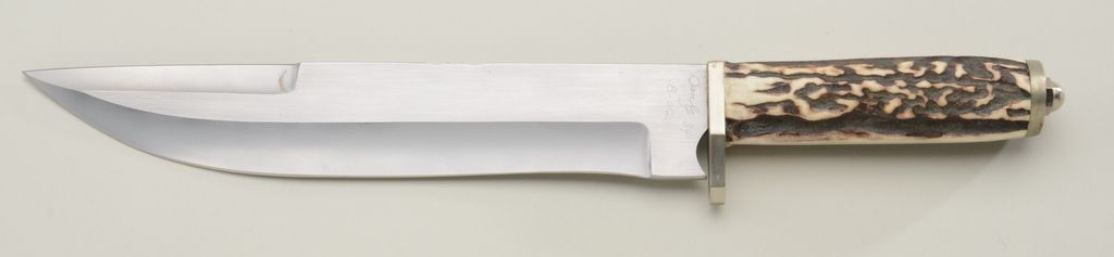 Large stag handled bowie knife signed “Dane, -84 B-012” on hilt in like new condition; approx. 17” overall with an approx. 12” clip-point blade; a beautiful custom knife. Est.: $500-$1,000.